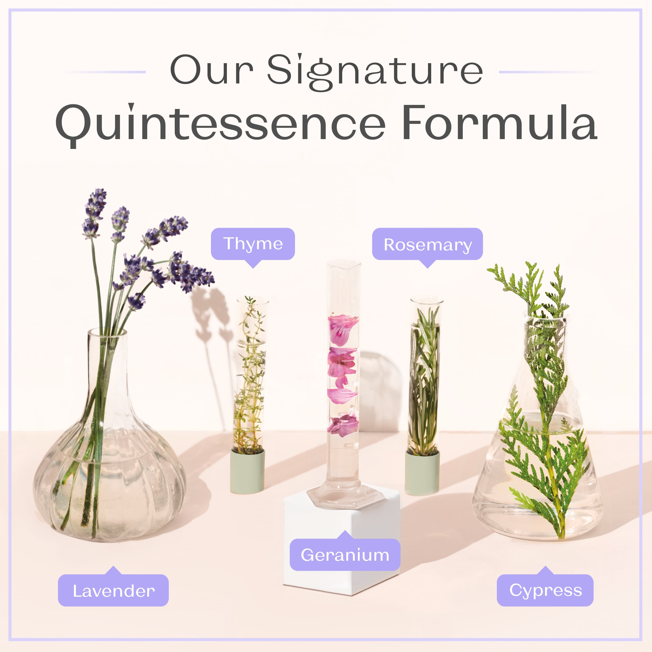 ラベンダー油*¹、タイムエキス*¹、ローズマリー油*¹、イタリアイトスギ油(サイプレス)*²、ニオイテンジクアオイエキス(ゼラニウム)*³